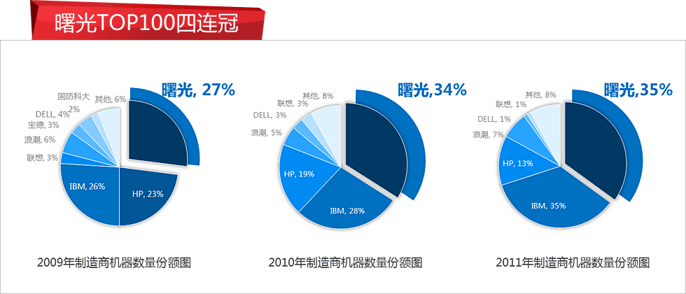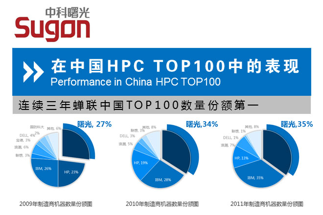 112011年:曙光启用全新国际化标识Sugon,并发布城市云战略。曙光公司以35套高性能计算系统的绝对优势斩获TOP100销量冠军,成功荣膺中国高性能计算三连冠。