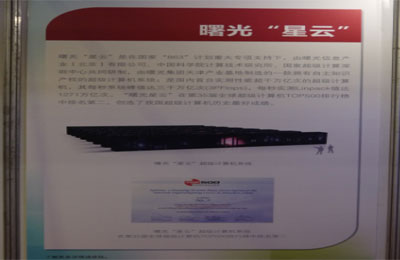 112010年:曙光"星云"超千万亿次超级计算机研制成功,是国内首台、全球第三实测性能超千万亿次的超级计算机,每秒峰值达三千万亿次,每秒实测Linpack值达1.271千万亿次,为世界第二,其同时还是绿色的超级计算机,每瓦能耗实测4.8亿次,核心部件采用全新曙光TC3600刀片服务器。